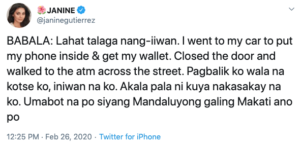 Kapuso actress Janine Gutierrez related a funny story about her driver who left her alone when she just stopped by an ATM in Makati.