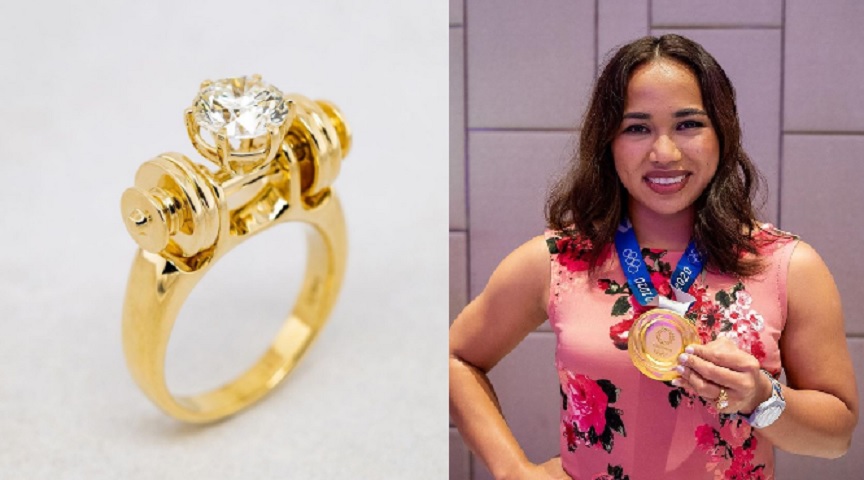 Olympic gold medalist Hidilyn Diaz wore a barbell shaped ring as she got engaged to her boyfriend and coach Julius Naranjo.