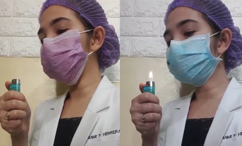 Dra. Leslee Anne Herrera showed that breathing through the mask and trying to blow off the fire on a lighter is an easy test to see if your medical mask is fake or not, as per a video posted by netizen Apple Flores Buñing.