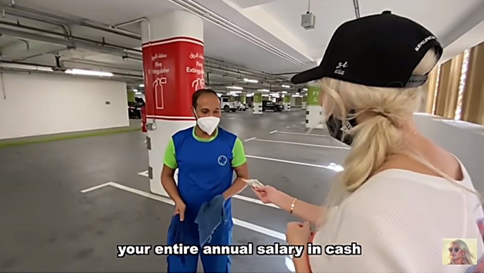The vlogger first gave him AED100. She later on asked how much Ismail makes in a month.