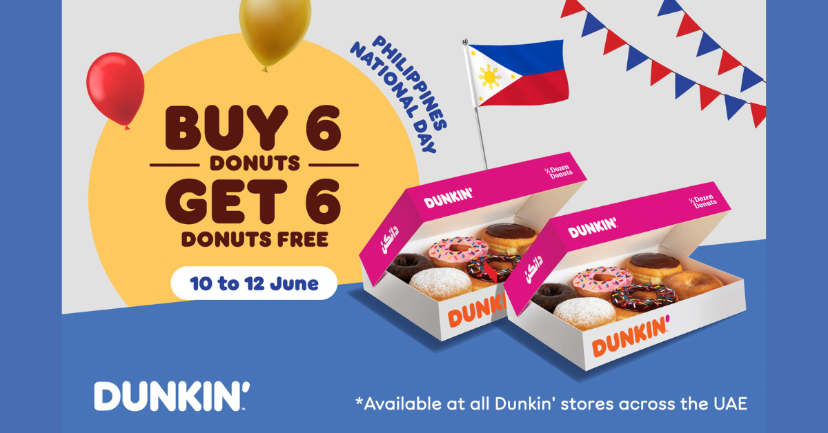 From Tuesday, 10 June to Thursday, 12 June, Dunkin’ is celebrating the Philippines National Day across all their stores in the UAE with limited-time offers you’ll love: Buy 6 donuts and get 6 FREE, or enjoy a FREE donut with any beverage you purchase. Join the celebration by visiting any Dunkin’ store in the UAE and make the most of these sweet deals!