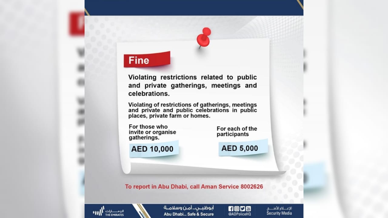 A fine of AED10,000 will be imposed for the organizer of the gatherings while each participant will be fined AED 5,000.
