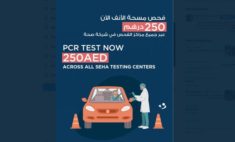 “For your convenience, we have reduced the price of the PCR nose swab test effective immediately across all SEHA testing centers,” announced SEHA in its official Twitter account.