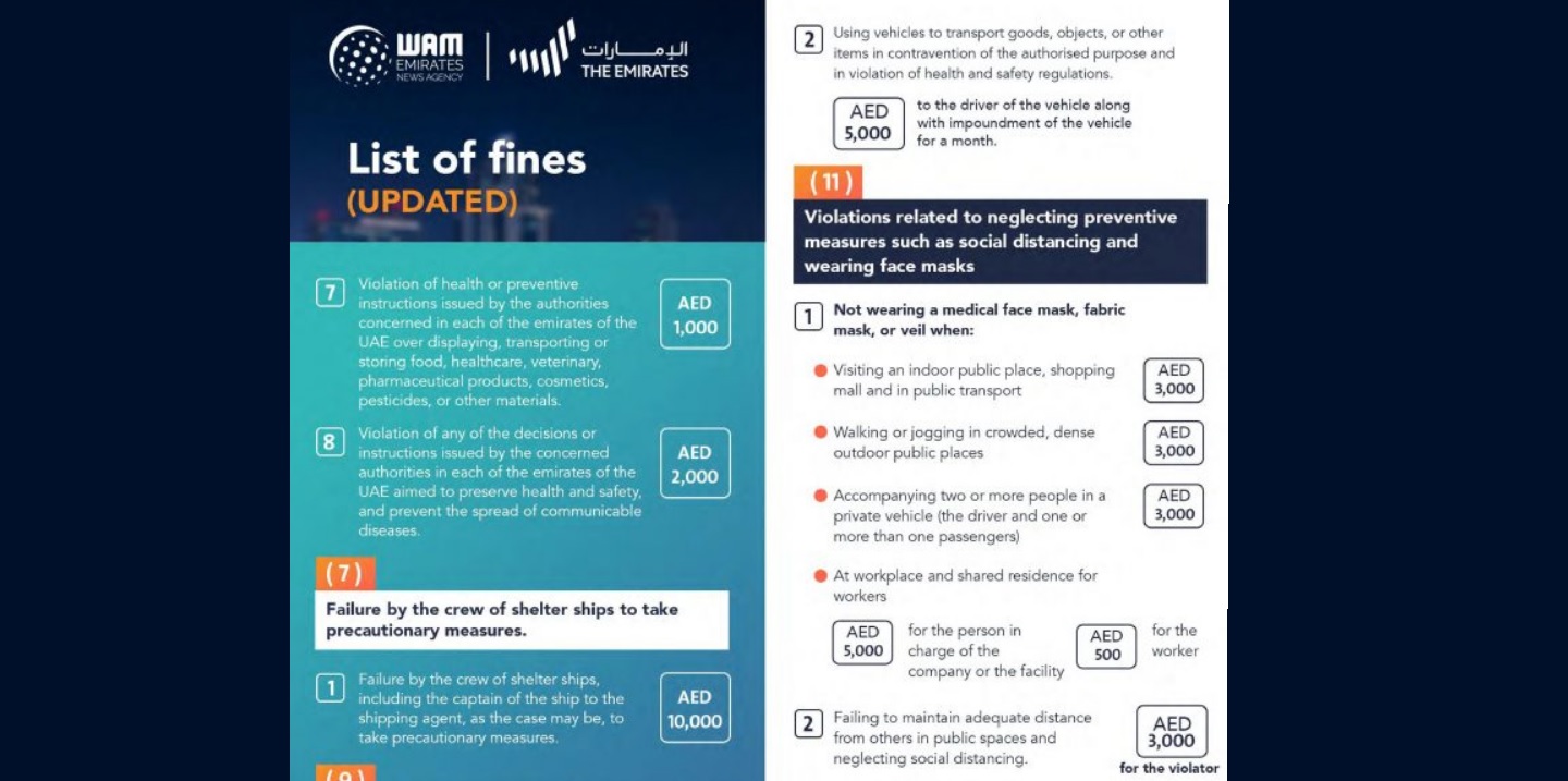 – Violation of the preventive conditions or measures, which the relevant authorities in each emirate announce for the maximum number of people practicing sport or leisure activities at outdoor places, private beaches of hotels, while picnicking or gethering at public parks