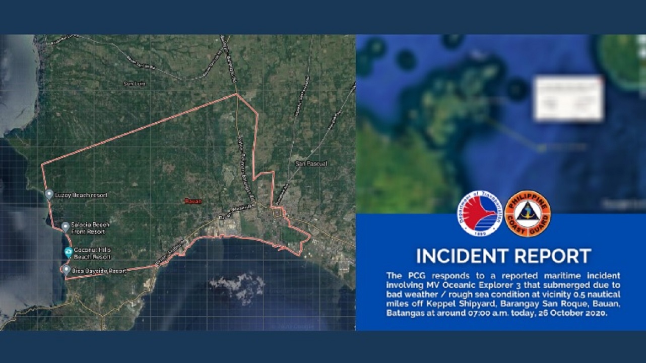 In an incident report, the PCG said the vessel sank due to bad weather and rough sea conditions 0.5 nautical miles off Keppel Shipyard, Barangay San Roque in Bauan at 7 a.m.