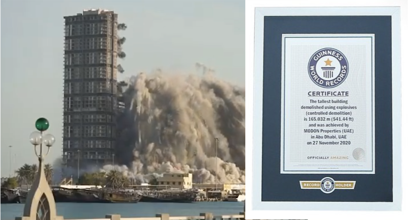 The demolition of Mina Plaza in Abu Dhabi, Friday, has recorded a Guinness World Records for the tallest building demolished using explosives (controlled demolition).