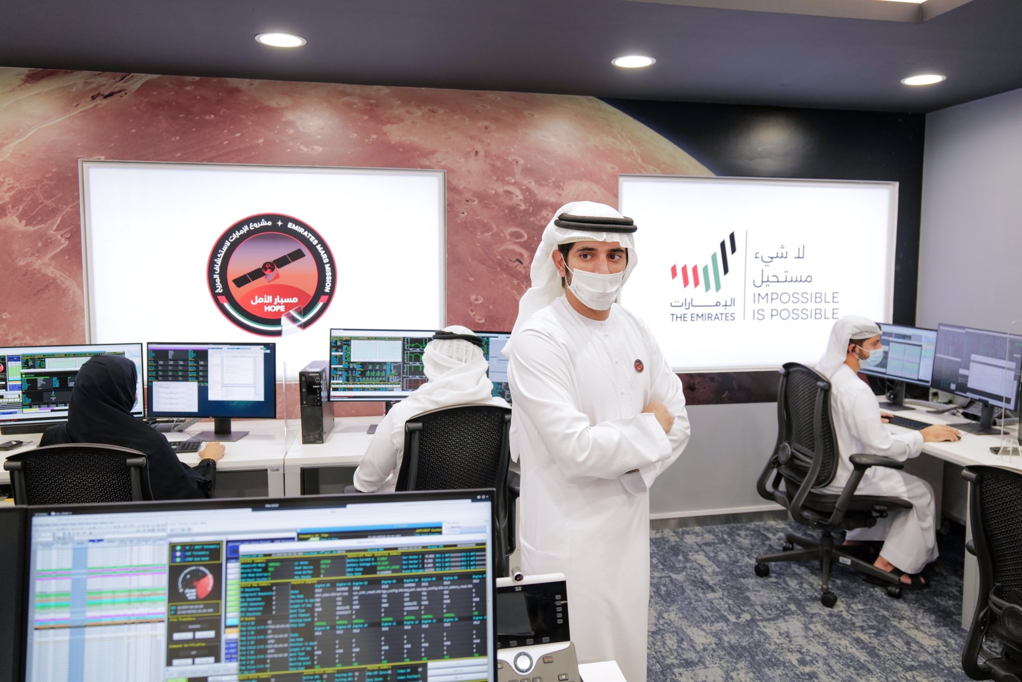 His Highness Sheikh Hamdan bin Mohammed bin Rashid Al Maktoum, Crown Prince of Dubai and Chairman of the Mohammed Bin Rashid Space Centre reviewed the final preparations of the Hope Probe Mission team, as the mission readies to enter its most critical phase – the Mars Orbit Insertion – on 9 February at 7.42 pm (UAE time). Sheikh Hamdan was accompanied in the review meeting held at the ground control centre of the Mohammed Bin Rashid Space Centre (MBRSC) in Dubai by Mohammed bin Abdullah Al Gergawi, Minister of Cabinet Affairs.