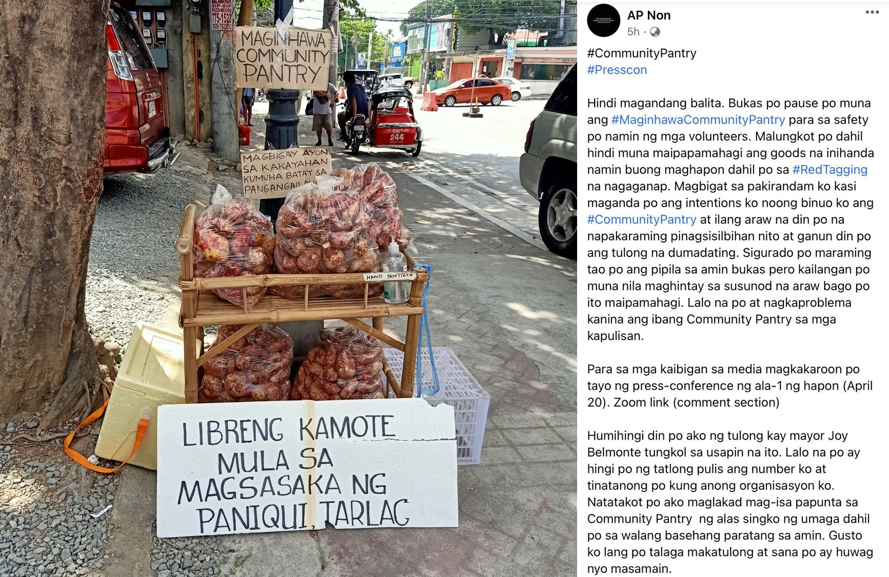 “Natatakot po ako maglakad mag-isa papunta sa community pantry ng alas-5 ng umaga dahil po sa walang basehang paratang sa amin. Gusto ko lang po talaga makatulong at sana po ay huwag nyo masamain,” she said in a Facebook post.