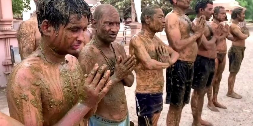 Participants wait for the dung and urine mixture on their bodies to dry, they hug or honour the cows at the shelter, and practice yoga to boost energy levels.
