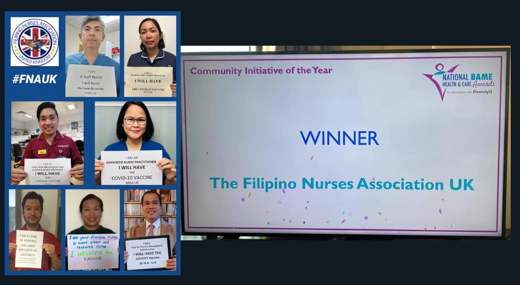 Barely a year after it was constituted, the selfless work being done by the Filipino Nurses Association United Kingdom (FNA UK) has bagged the prestigious National BAME Health Care Awards for Community Initiative of the Year.