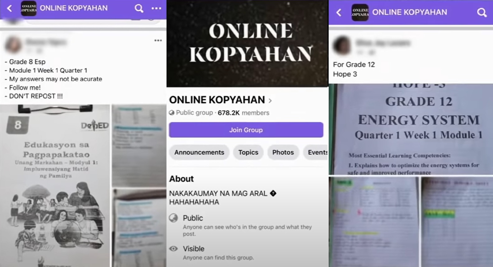 The Facebook group “Online Kopyahan” is facing complaints of encouraging cheating in online learning tests and exams.