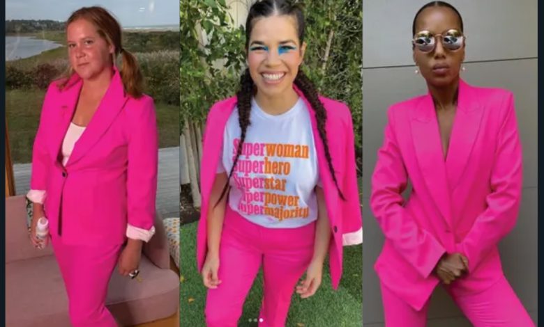 The “Political pink” has become the colour of activism in the US and this week celebrities including Kerry Washington, Amy Schumer and Zoe Saldana posted selfies on Instagram wearing pink pantsuits.