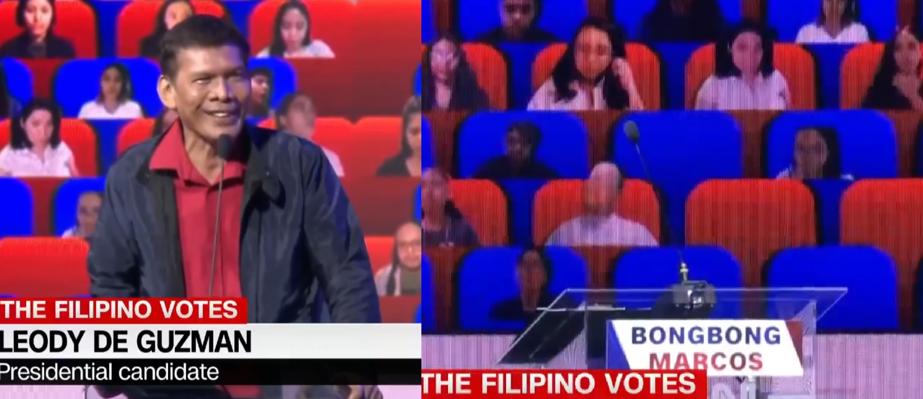 In a presidential debate organized by CNN Philippines, labor leader Leody de Guzman questoons the absence of frequent skipper Ferdinand Marcos Jr.