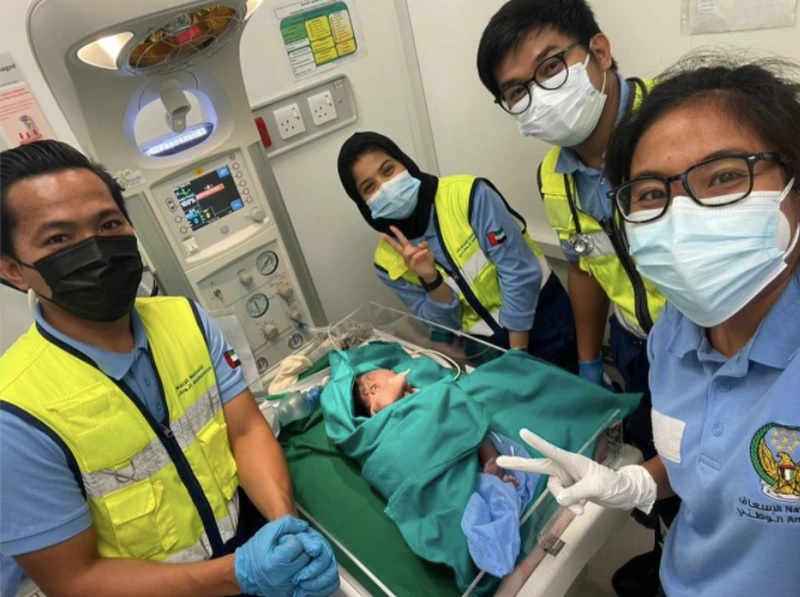 However, the woman suffered severe labour pains on the way to Sheikh Khalifa Hospital and delivered a baby with the help of the emergency medical team from the National Ambulance within the vehicle.
