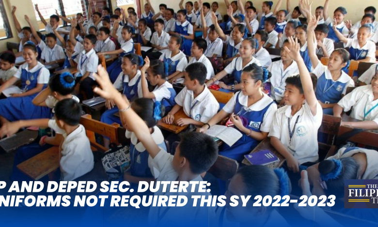 Vice President and Department of Education Secretary Sara Z. Duterte announced through a Viber message on Monday, July 18 that learners will not be required to wear school uniforms for the coming school year 2022-2023.