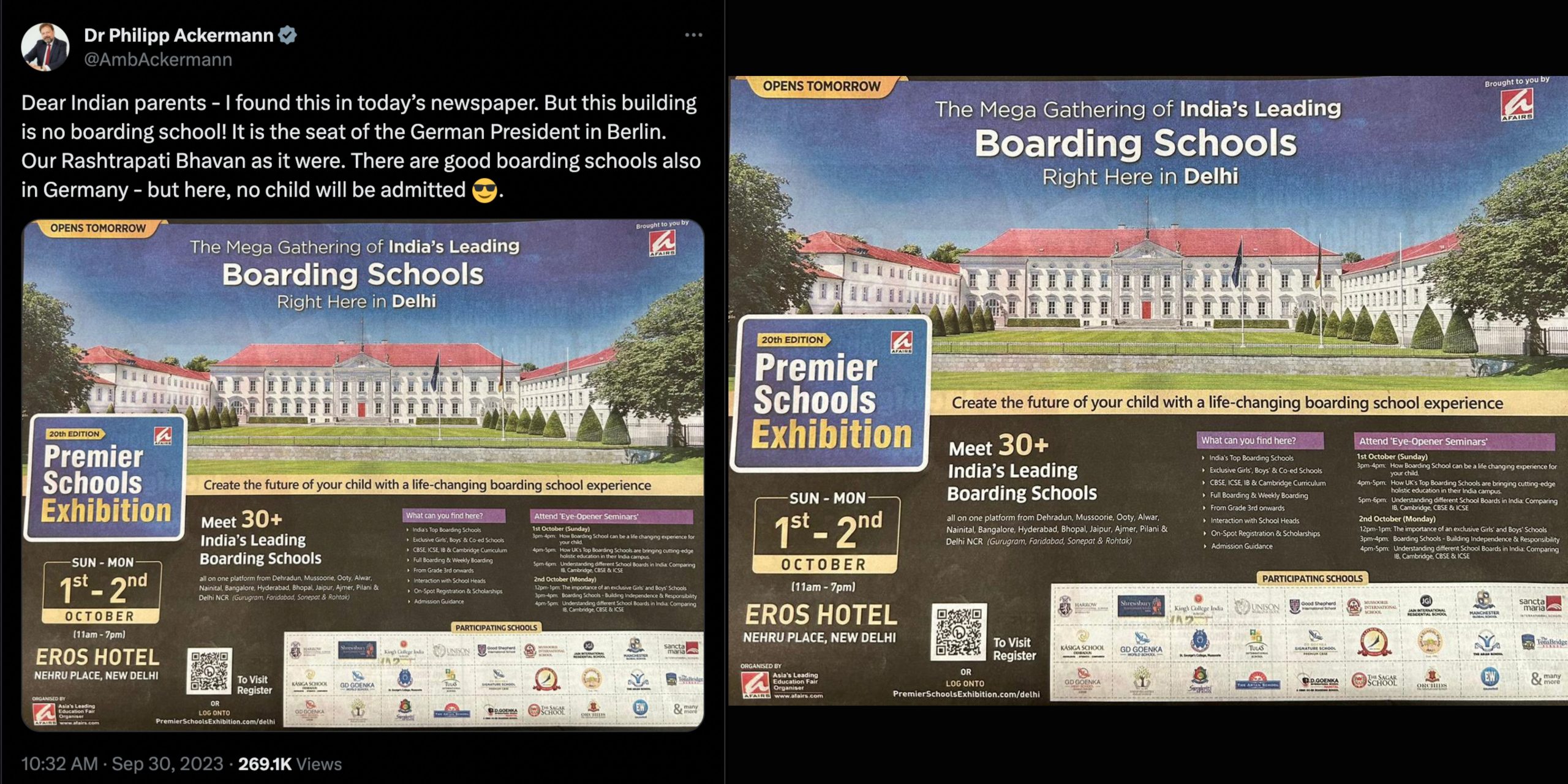 “Dear Indian parents – I found this in today’s newspaper. But this building is no boarding school! It is the seat of the German President in Berlin, our Rashtrapati Bhavan,” reads his comment.