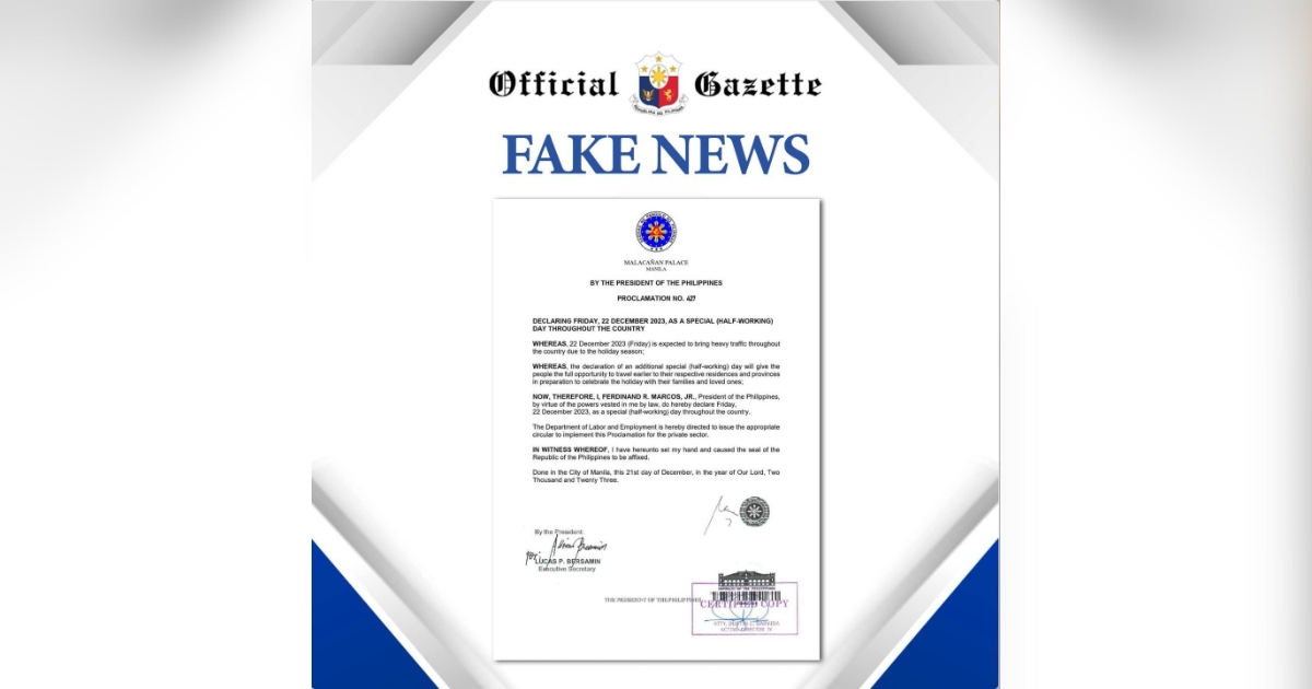 The Official Gazette says the document claiming to be Proclamation No. 427, declaring Friday, December 22, 2023, as a special (half-working) day across the Philippines with President Bongbong Marcos’ signature, is “fake.”