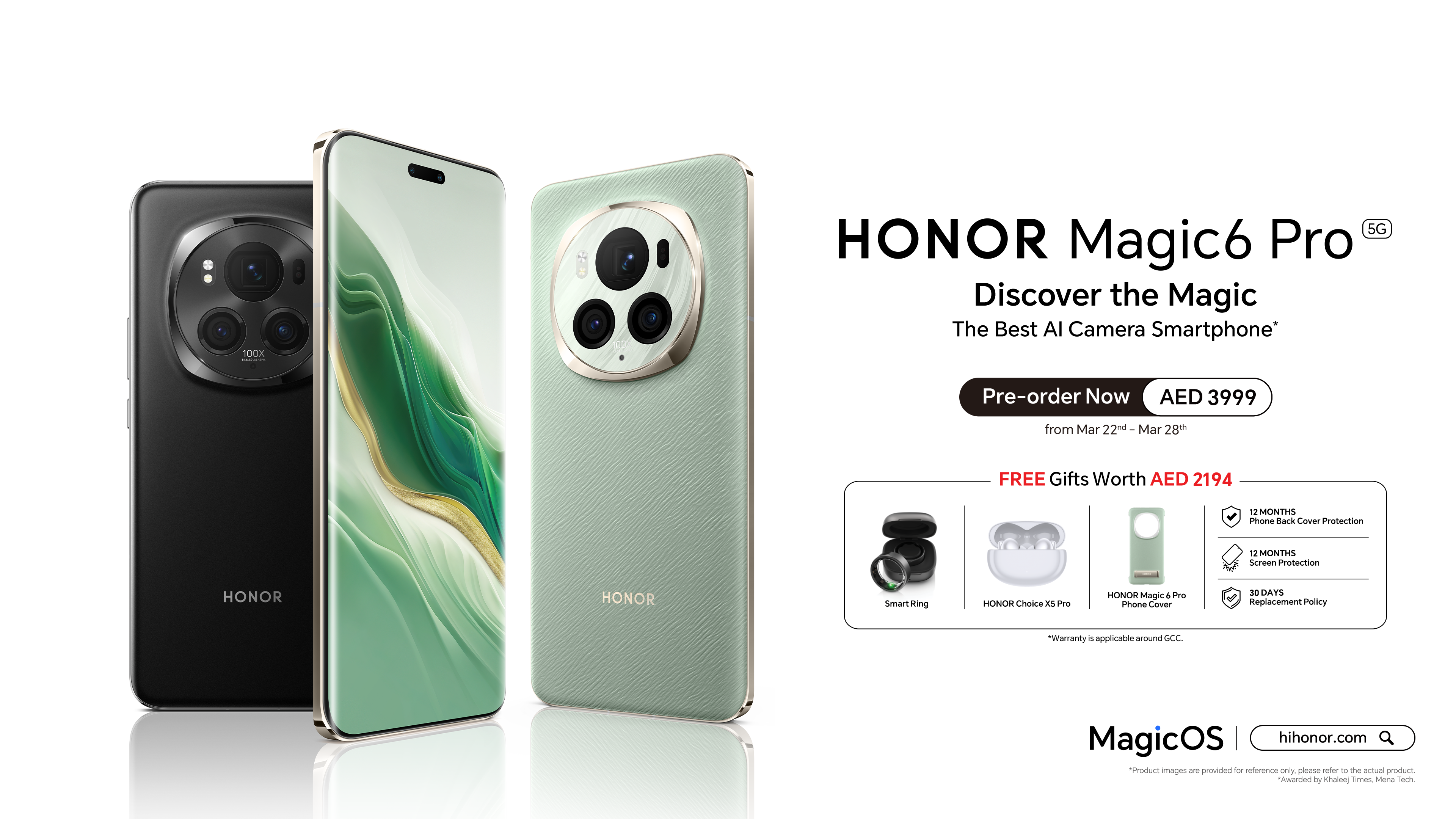 HONOR Magic6 Pro is available for pre-order Black and Epi Green for AED 3999. Upon purchase, consumers will get free gifts worth AED 2194 including Smart Ring, HONOR Choice X5 Pro, HONOR Care+ and more. Consumers can get HONOR Magic6 Pro through HONOR Online Store, Hihonor, Etisalat by e&, Emax, Sharaf DG & Jumbo.