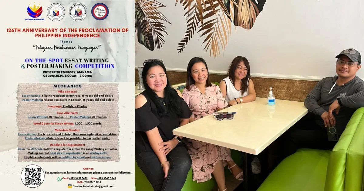In celebration of the 126th Philippines Independence Day, the Filipino Writers’ Circle (FilWrite) in collaboration with the Philippine Embassy Manama and Migrant Workers Office (MWO), Bahrain is delighted to announce an exciting opportunity for all creative-minded Filipinos to participate in the ‘’On the Spot Essay Writing and Poster Making’’ contests to showcase their talents on the theme that revolves on freedom, love of country and future aspirations. This will be held on 8 June 2024 at the Philippine Embassy.