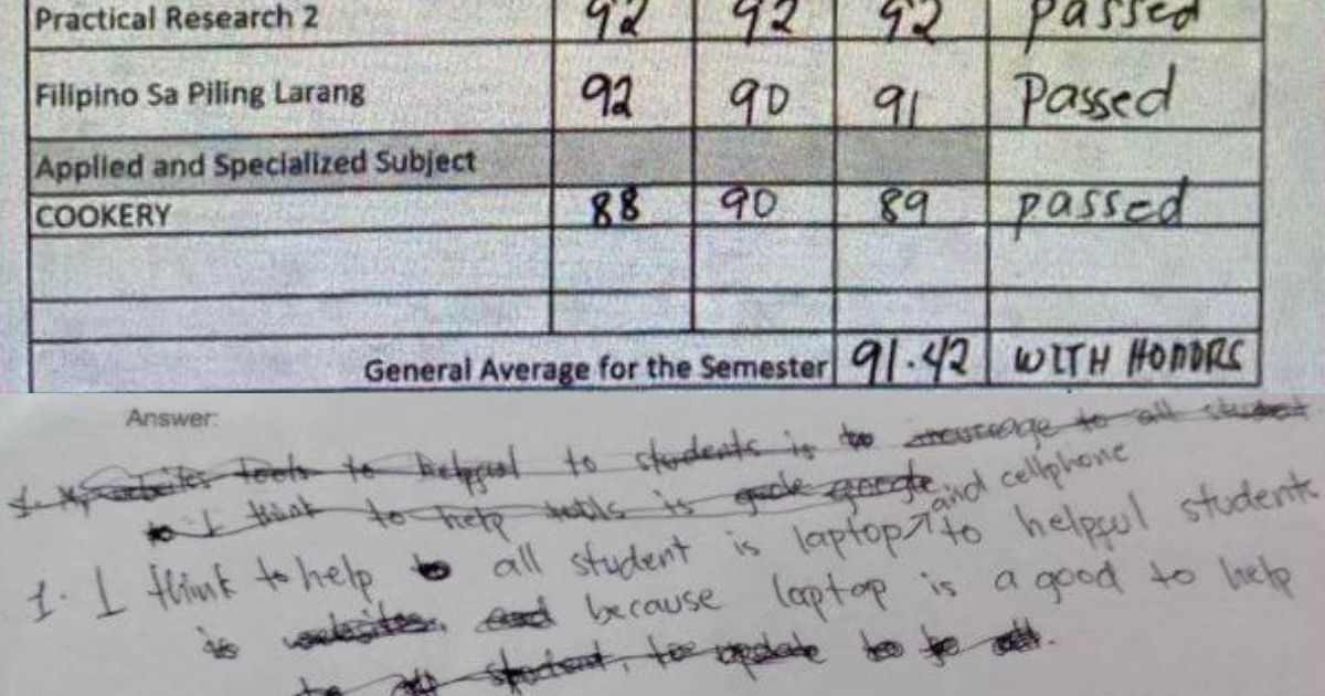 “Here is the report card of an applicant to our BSHM course and one of that student’s answers to an essay question. The student has stellar grades on the report card but struggles to string together a simple sentence in English, reads at a snail’s pace, and misinterprets even the simplest instructions,” the caption wrote.