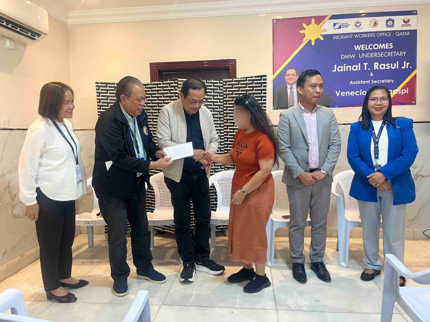 The aid was personally handed over by Undersecretary Jainal T. Rasul Jr., Assistant Secretary Venecio Legaspi, and Labor Attaché Eduard Ferrer.