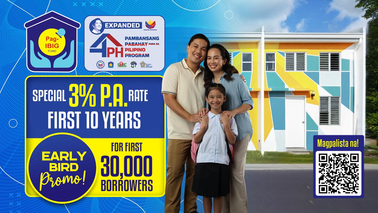 Pag-IBIG Fund will grant its special 3% housing loan rate for the first 10 years of the loan term, double the standard five years for the subsidized rate, to the first 30,000 eligible borrowers under its housing loan for the Expanded Pambansang Pabahay para sa Pilipino (Expanded 4PH) Program.
