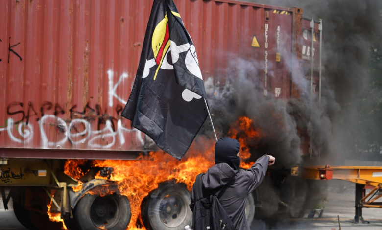 Police said officers were hit with rocks, bottles, and improvised weapons, while burning tires and barricades hampered emergency responders in some areas.