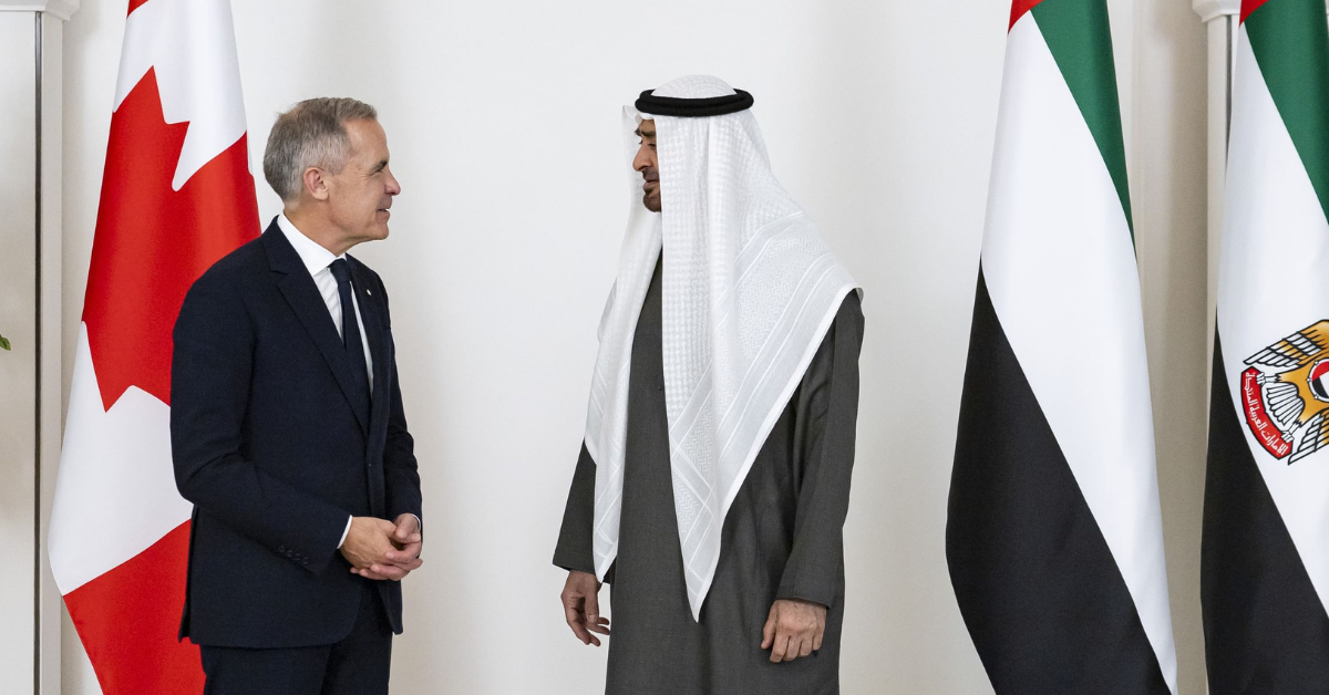 Prime Minister Carney, on an official visit to the UAE, was welcomed at Qasr Al Shati in Abu Dhabi by Sheikh Mohamed.