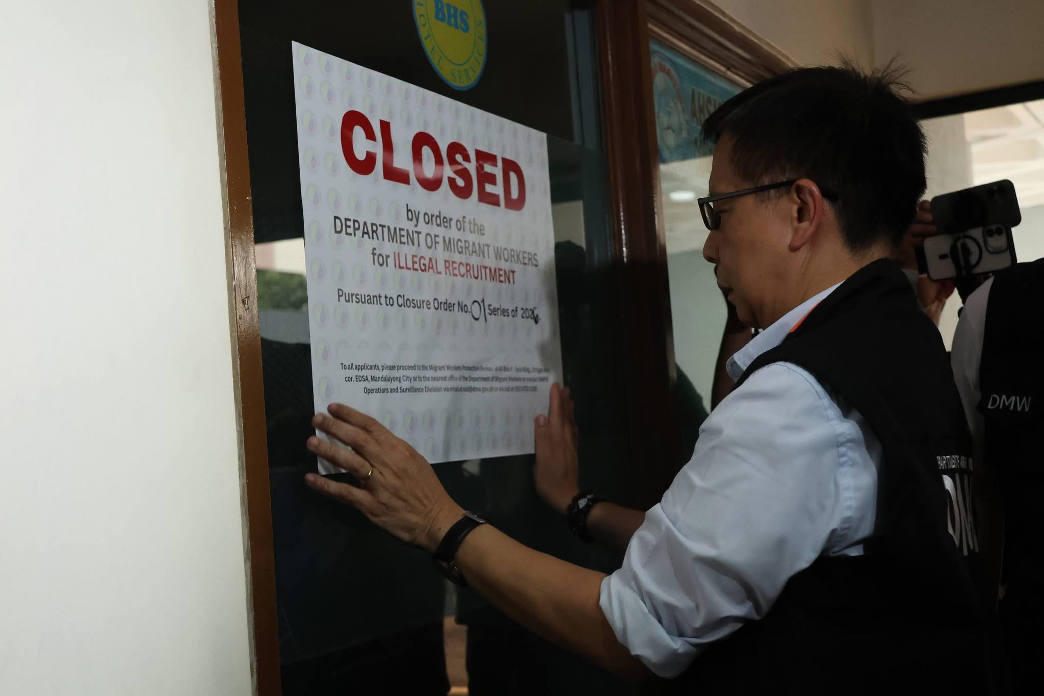 The closure was led by Migrant Workers Secretary Hans Leo J. Cacdac, along with Undersecretary Bernard P. Olalia and Assistant Secretary Jerome A. Alcantara, following complaints from victims and confirmed surveillance activities.