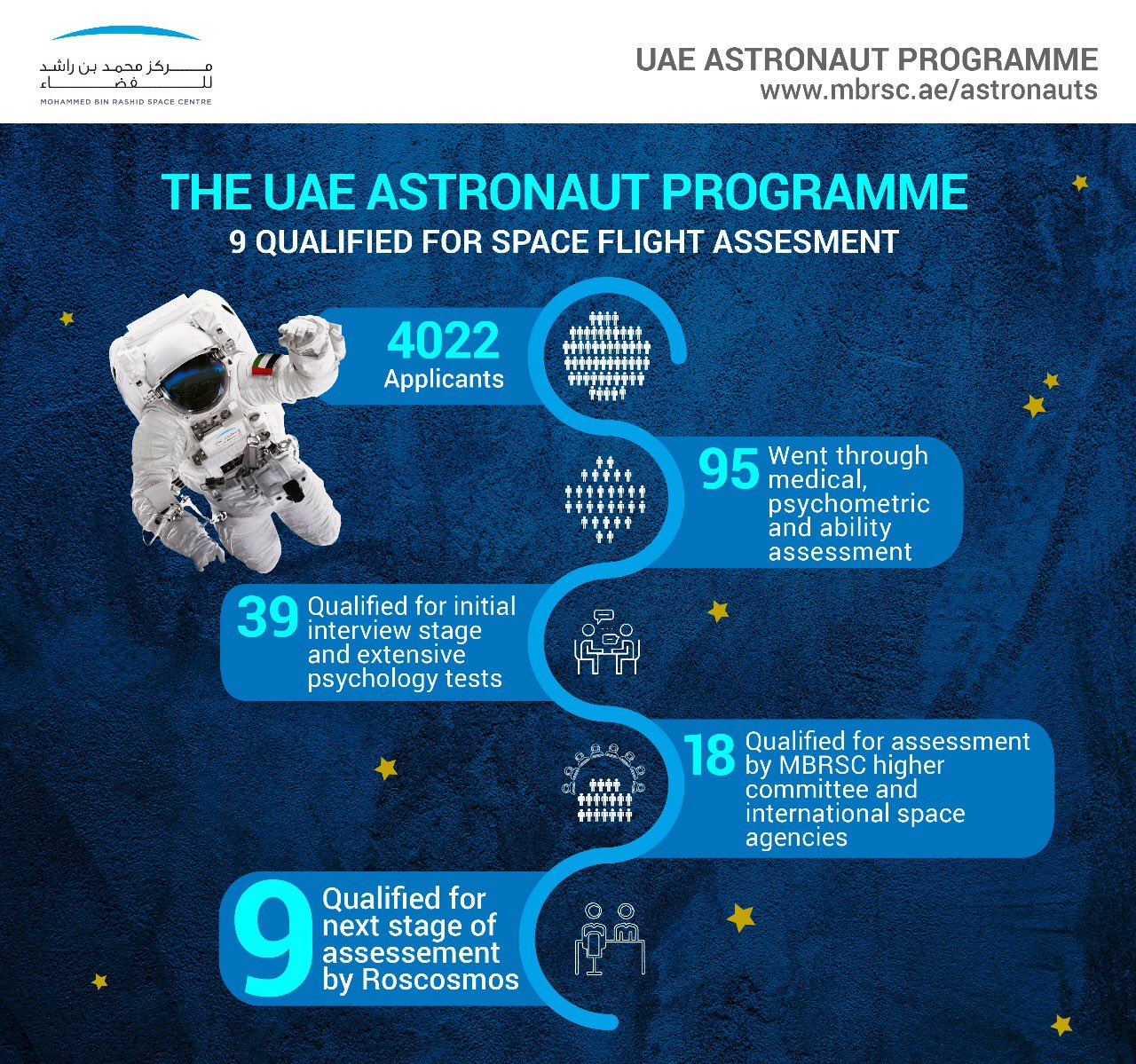 Nine were chosen from the original 18 through face-to-face interviews. The candidates will be evaluated by the Roscosmos State Corporation for Space Activities in Russia, reported Gulf News.
