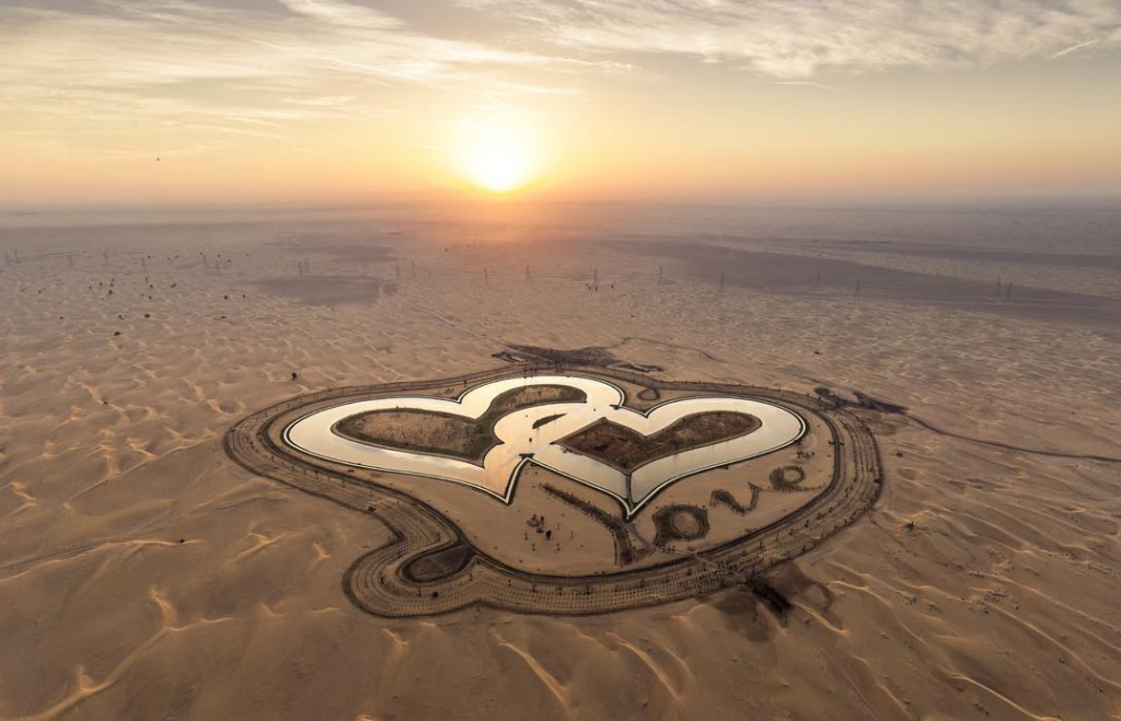His Highness Sheikh Hamdan bin Mohammed bin Rashid Al Maktoum, Crown Prince of Dubai, shared a photo of a new man-made lake in Dubai that looks like two intertwining hearts.