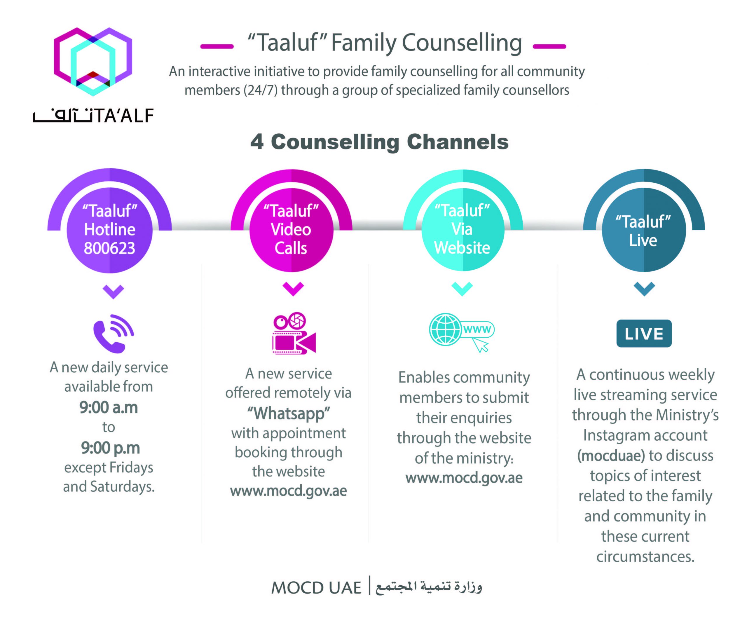 (WAM) —The UAE’s Ministry of Community Development (MoCD) has launched four interactive channels under a new initiative named ‘Taaluf’ to provide family counseling for free to all UAE community members.