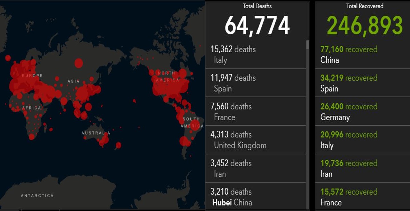 More than 64,000 people have died from the coronavirus pandemic, and the number of confirmed cases in 181 countries has passed 1.2 million, according to John Hopkins University figures.