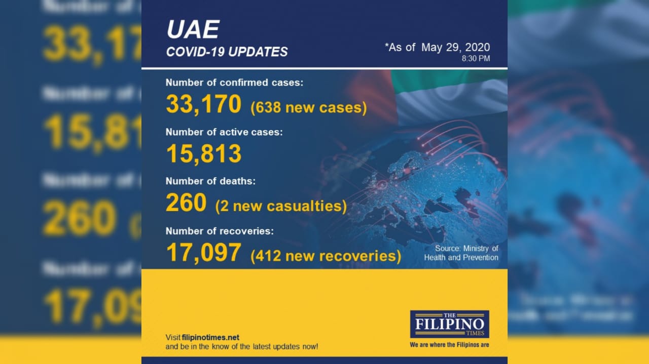 The Ministry of Health and Prevention conducted additional 36,000 Covid-19 tests, which revealed 638 new cases bringing the total number of cases to 33,170, @mohapuae announced today. #UAEGov