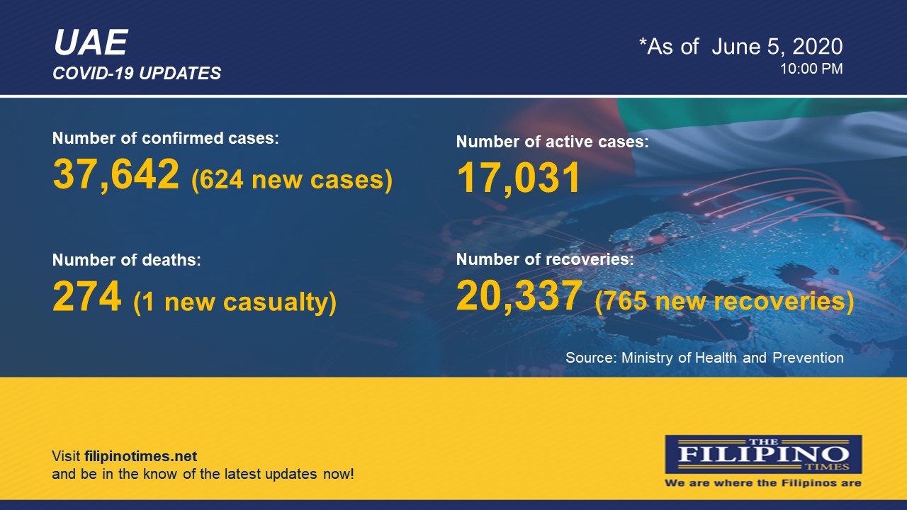 MOHAP also reported that 624 new patients of the coronavirus disease coming from an additional 44,000 new COVID-19 tests conducted by health specialists, bringing the total number of cases in the country to 37,642. In line with this, the number of active cases went down from yesterday’s 17,173 to only 17,031 today, June 5.