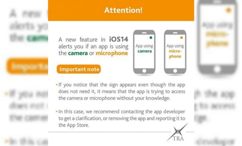 The Telecommunications Regulatory Authority issued an alert for iPhone users to remain vigilant and to always check if the apps that they use control either their camera or microphone without their consent.