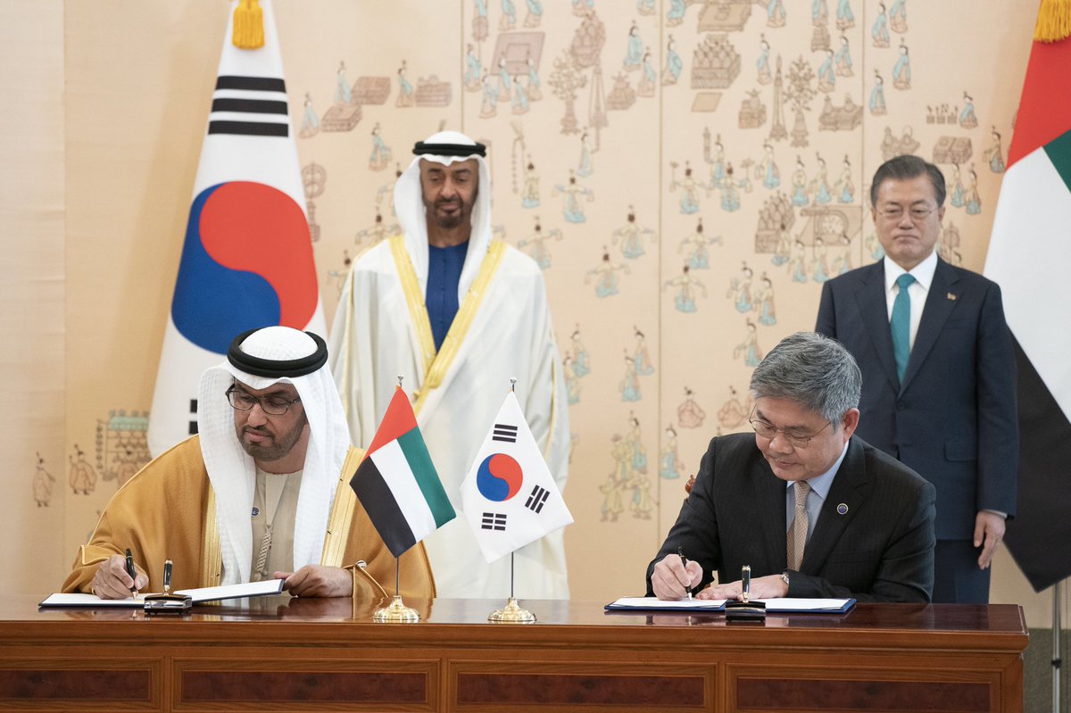 His Highness Sheikh Mohamed bin Zayed Al Nahyan, Crown Prince of Abu Dhabi and Deputy Supreme Commander of the UAE Armed Forces, and South Korean President Moon Jae-in witnessed the signing of an agreement between Abu Dhabi National Oil Company (ADNOC) and South Korea Engineering and Construction (SKEC) to build the world’s largest crude oil storage facility in Fujairah.