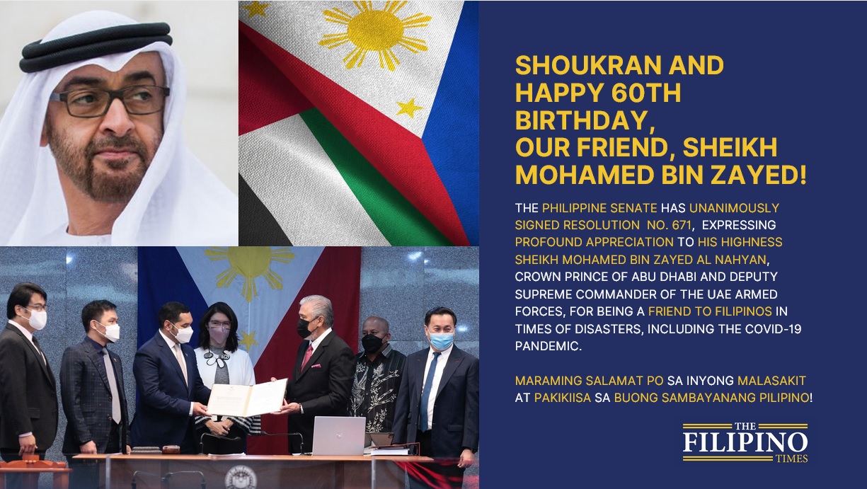 “Our dear friend His Highness Sheikh Mohammed bin Zayed Al Nahyan will be celebrating his 60th birthday tomorrow. He was born on March 11, 1961. It is timely that we show to him, our people’s appreciation for his gestures of friendship by the recognition of the Senate of the Philippines…” he added.